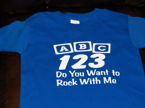 This item is a child blue T-Shirt with the words, ABC 123 Do You Want to Rock With Me written in white.