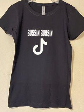 This item is a girl's short-sleeved shirt with the words Bussin Bussin written in black. The shirt comes in black or white and can be worn with white pants or tights.