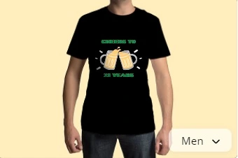This item is a man 21st Birthday Shirt. It comes in a black color T-Shirt with two beer mugs and the words, that says Cheers to 21 Years on the front of the Shirt. You can also add a name on the back of the shirt at no extra charge. All have to do is type the name you want to add in the comments section at check out.