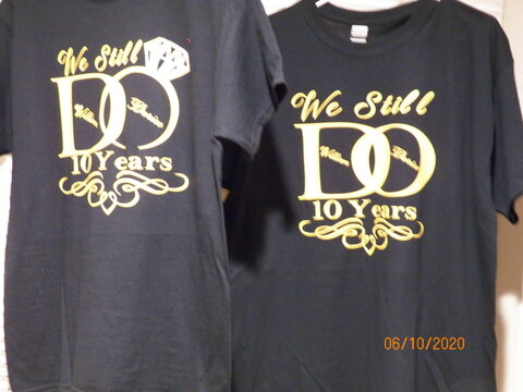 This is a woman and man T-Shirt, with the words We Still DO 10 Years on the front of the shirt and 2010 on the back of the shirt. Its normally for a Anniversary. The T-Shirt is black with gold writing on the front & Sunset Writing on the back. This Shirt is $30.00 per person. So if you are buying as a couple, you would need to set your quantity as 2 for the amount in your cart.
